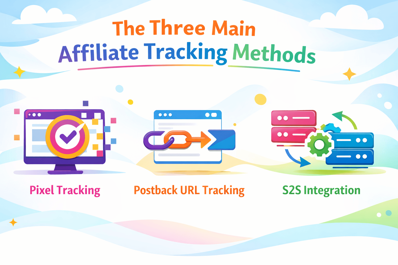 Simples em teoria. A complexidade está na forma como a terceira etapa realmente acontece, e é aí que o rastreamento de pixels, URLs de postback e integrações de S2S adotam uma abordagem muito diferente.